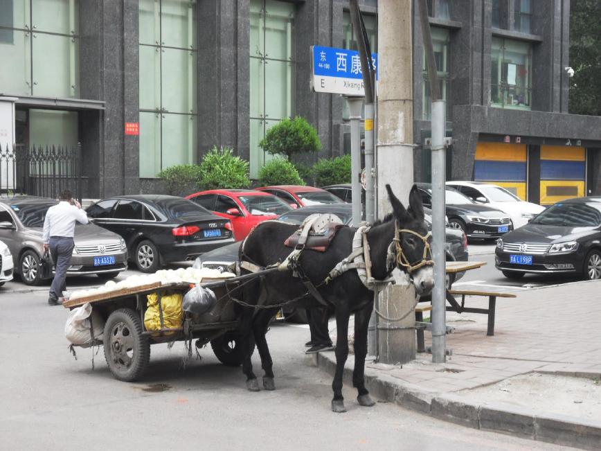 向北走的老人在路口转向西,经过一个十字路口。一个五十多岁的男人,牵一头骡子,骡子拉一辆平板车,四个铁掌踩在地上,“嘎达…嘎达…”。车上除甜瓜外还有一个桶,桶里有粮草。那个人将草料桶放在骡子跟前,它慢慢地吃,吃完了就安静地站在那里,摇着尾巴看着过路的人,无声无息。我走近前,摸摸它的头,它温顺地看着我。那一天,我买了10块钱甜瓜。“都是自家种的,没抹药,自然熟,放心吃就行”,他掰了一块放在嘴里。“你是从哪里来的?”“城南农村的,边走边卖。”城里的路已经不叫马路,而是沥青路、水泥路,这头骡子走在路上,“嘎达…嘎达…”,这个声音占据了周围的有限空间,始终无法逃脱在无意义中消失的机制。它站在小区街角,像一个具有怀念意义的景观。