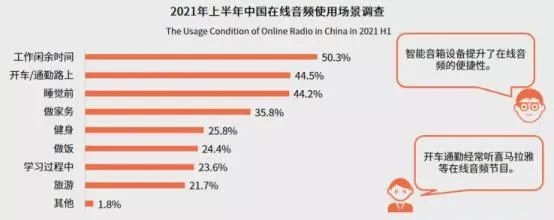 比如人们会选择在做饭做家务、吃饭、走路、挤地铁这样的场景下听音频,这大多基于一种节约时间的一种心理,两件任务并行。