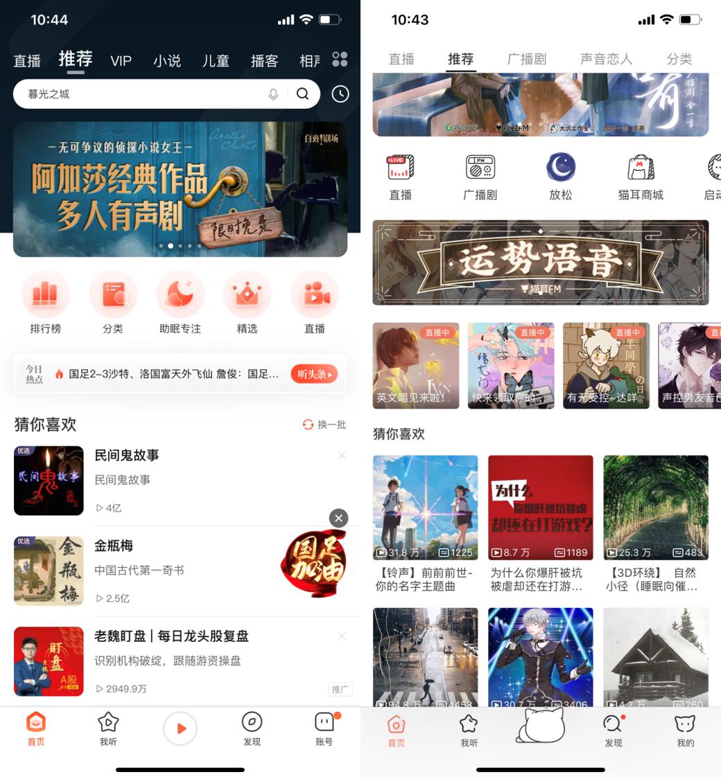 如前所述,算法在内容行业已经是标配,但我们看到当下从喜马拉雅到荔枝FM、猫耳等一众产品来看,APP首页均是传统的网页布局,缺乏个性化的精准算法推荐机制。