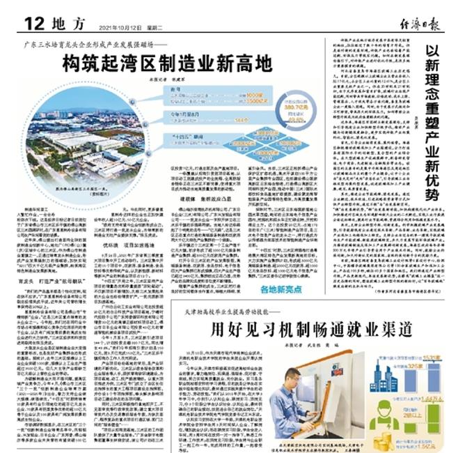 10月12日,《经济日报》在“12版地方”刊登了题为《广东三水培育龙头企业形成产业发展强磁场——构筑起湾区制造业新高地》的报道,重点聚焦三水区制造业高质量发展。