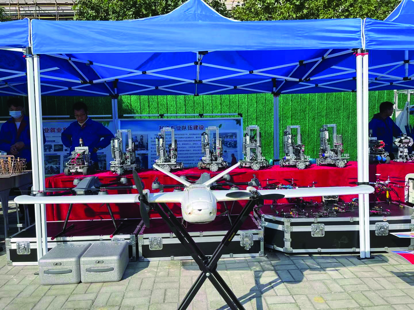 无人机、机器人,琳琅满目的智能装备……郑州商业技师学院的同学们正忙着摆放自己的成果。“这些无人机和机器人,都是同学们自己动手做的。”郑州商业技师学院电气工程系教务科李成勇介绍,一个小组三位同学,需要半个月左右。“别看用时久,同学们在制作好作品后,会不停地进行调试,直到各项数值精确,才会试飞,同学们制作的机器人可以灭火、打篮球等。”