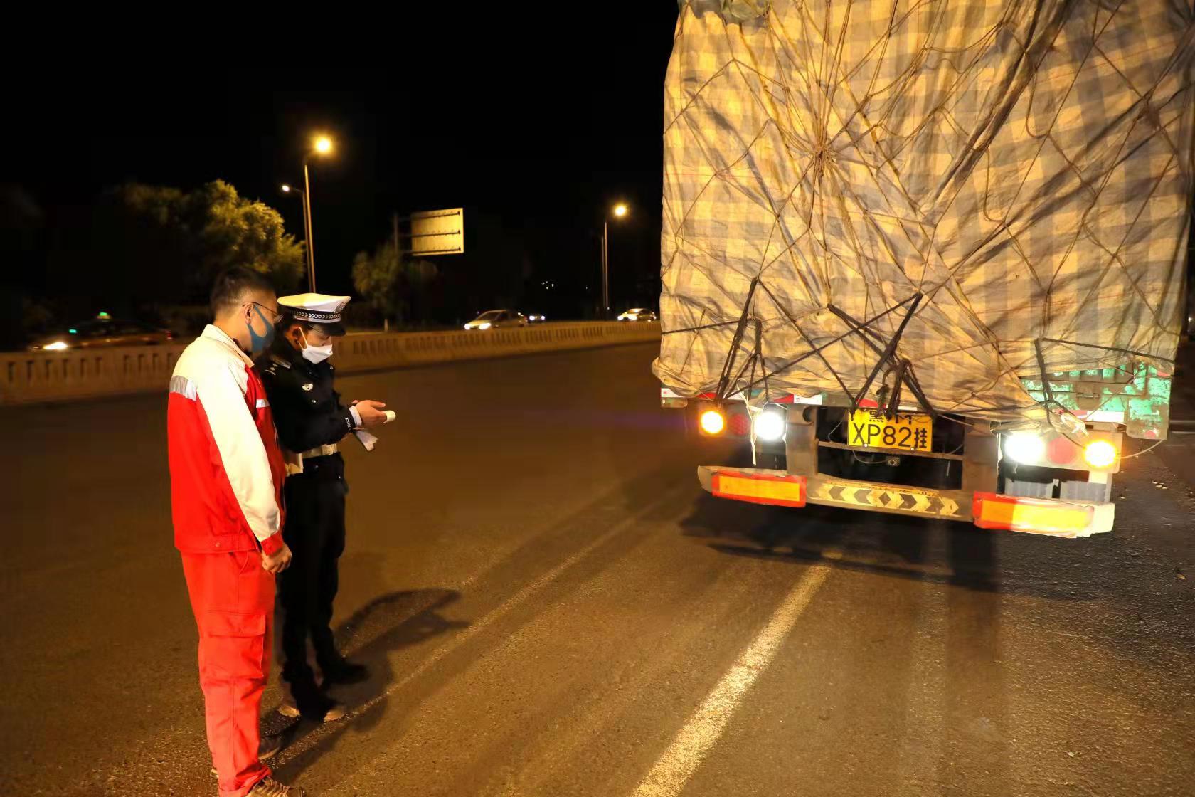 在夜查行动中,为提升整治成效,交警部门还采取异地互检、交叉巡逻等方式开展整治工作。21时30分许,交警南岗大队警力巡逻至哈西地区三环沿线王岗路口时,突然发现前方一辆黑AS6961号(黄牌)货车车胎变形严重,车身晃动明显,涉嫌超载,随即上前截停检查。经了解驾驶人对自己超载的行为全部承认,但是对于超载数量却始终不予交代,交警部门将车辆带至称重点位,结果显示该车超载达100%以上,严重超载。最终驾驶人将被处以罚款2000元、驾驶证记6分的处罚。