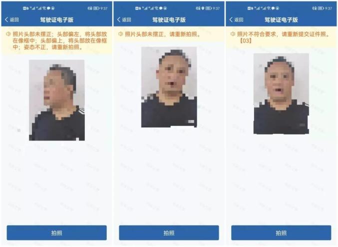 也可通过手机他人协助拍摄证件照或从手机相册选择证件照提交,着装、姿态、表情应符合驾驶证件照片的要求(具体要求附后),系统将对照片进行质量检测和人脸比对,检测比对通过的,提交网办中心批量审核,不通过的,提交网办中心单条审核,网办中心3次审核未通过的,提示驾驶人去车管所申领电子驾驶证。通过综合应用平台受理的,驾驶人可在照相馆或车管所拍摄证件照片,并由工作人员审核后上传。