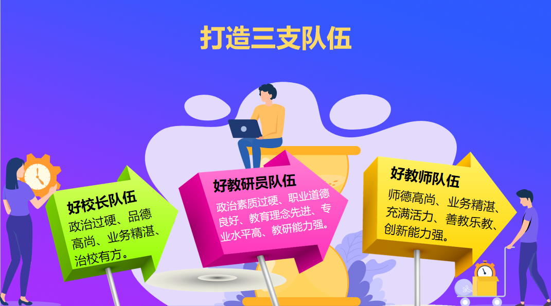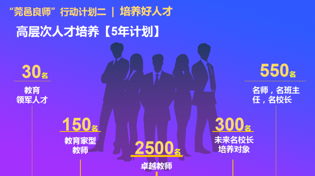 “莞邑良师”行动计划提出要打造三支队伍,为打造“品质教育”、推动教育高质量发展提供人才保障,包括一支政治过硬、品德高尚、业务精湛、治校有方的好校长队伍;一支政治素质过硬、职业道德良好、教育理念先进、专业水平高、教研能力强的好教研员队伍;一支师德高尚、业务精湛、充满活力、善教乐教、创新能力强的好教师队伍。