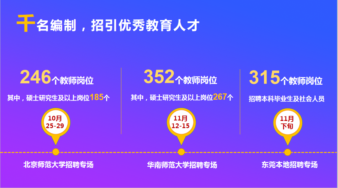我市在教师编制紧缺的情况下,今年用近千名编制招聘教师。今年下半年共开展三场公开招聘活动,共拟招聘公办教师913名。第一场招聘活动是10月25—29日赴北京师范大学设点面向全国招聘优秀毕业生,主要是高中阶段学校,共246个岗位,其中硕士研究生及以上岗位185个,占比75.2%。第二场招聘活动是11月12—15日赴广州华南师范大学设点面向全国招聘优秀毕业生,扩大到镇属中小学,共352个岗位,其中硕士研究生及以上岗位267个,占比75.9%。在赴高校专场招聘中,实行考生可报考同一个组内两所学校同一学科岗位,最后按分数优先录取。第三场招聘活动是11月下旬进行,在东莞本地设点面向全国招聘毕业生和社会人员岗位315个,其中毕业生岗位159个,社会人员岗位156个,以招聘本科岗位为主。在本地场招聘中,向有丰富工作经验、有较好教育教学能力的社会人员倾斜,比如,具有中级及以上职称的教师岗位、获得市级奖励奖项的教师岗位、获得省媒体展示奖励奖项的音体美教师岗位、指导学生获得省比赛奖励的中职专业课教师岗位等,可不受开考比例限制。