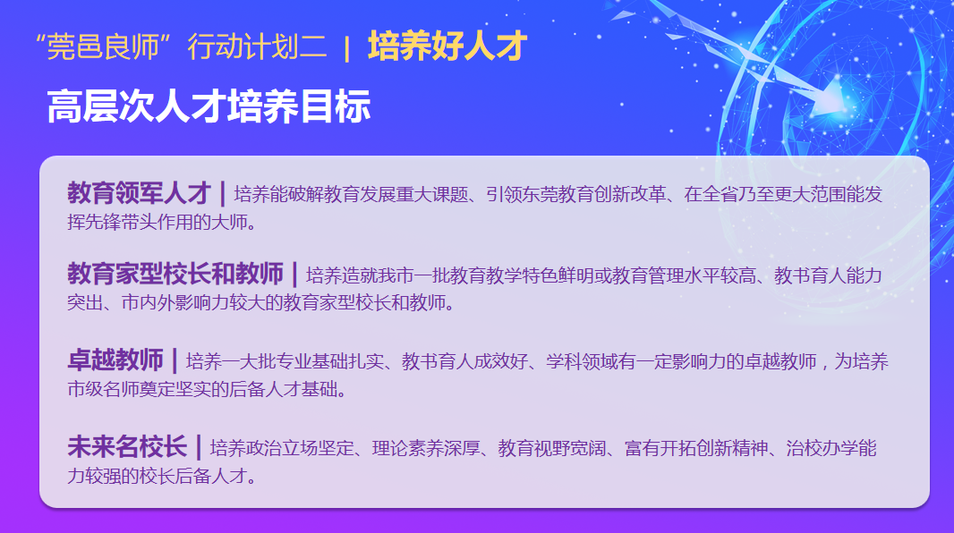 教育领军人才是对标国家和省关于基础教育高层次人才相关标准,培养能破解教育发展重大课题、引领东莞教育创新改革、在全省乃至更大范围能发挥先锋带头作用的大师。教育家型校长和教师是对照我省培养造就“数以千计的教育家型教师”的要求,培养造就我市一批教育教学特色鲜明或教育管理水平较高、教书育人能力突出、市内外影响力较大的教育家型校长和教师。卓越教师是对照我省培养造就“数以万计的卓越教师”的要求,培养一大批专业基础扎实、教书育人成效好、学科领域有一定影响力的卓越教师,为培养市级名师奠定坚实的后备人才基础。未来名校长是要面向未来培养政治立场坚定、理论素养深厚、教育视野宽阔、富有开拓创新精神、治校办学能力较强的校长后备人才。