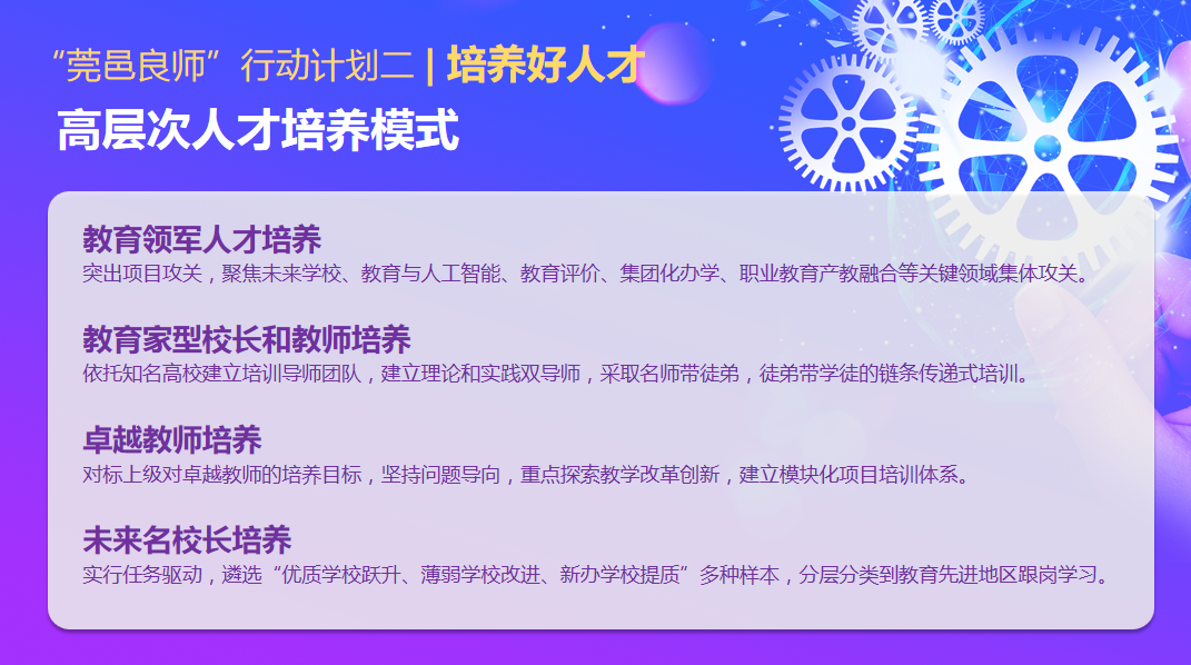 对教育领军人才培养,突出项目攻关,聚焦我市未来学校、教育与人工智能、教育评价、集团化办学、职业教育产教融合等关键领域集体攻关,并围绕攻关主题,以脱产方式到高层次教育科研机构、知名高校开展访学研修,对市内实践基地学校突出实践探索和运用。对教育家型校长和教师培养,计划依托知名高校教授、知名教育专家和学者建立培训导师团队,建立理论和实践双导师,采取名师带徒弟,徒弟带学徒的链条传递式培训。对卓越教师培养,对标上级对卓越教师的培养目标,坚持问题导向,重点探索教学改革创新,建立模块化项目培训体系。对未来名校长培养,不仅选配省市名校长工作室主持人作为指导专家,还要实行任务驱动,遴选“优质学校的跃升、薄弱学校的改进、新办学校的快速提质”等多种样本,分层分类到北京、上海、江浙等教育先进地区知名品牌学校跟岗学习,制定本校行动改进方案,为东莞“培养一批,储备一批”未来名校长。