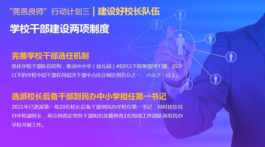 同时,为了加强学校干部建设,还推出了两项制度。一是重新制定了中层干部选任办法,完善学校干部选任机制,优化学校干部队伍结构,推动中小学(幼儿园)45岁以下校级领导干部、35岁以下的学校中层干部在同层次干部中占比分别达到五分之一、六分之一以上。二是选派校长后备干部到民办中小学担任第一书记。今年已选派第一批10名校长后备干部到民办学校任第一书记,同时挂任民办学校副校长,再分别选定党务干部和名优教师各1名组成工作团队派驻民办学校开展工作,推动民办学校建立健全第一议题、开展思政第一课、完善党组织生活。