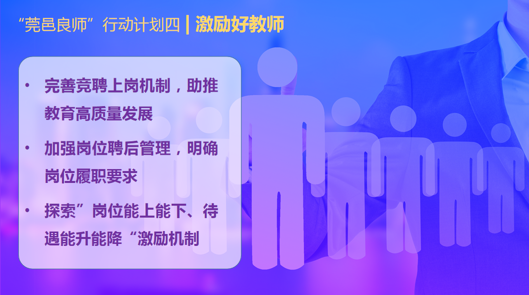 围绕这个目标,行动计划提出了五方面23条举措,包括:加强和改进新时代师德师风建设、推动教师队伍扩容、建立精准培养培训体系、完善激励保障机制、健全教师管理机制等。今年主要落实以下四方面工作。