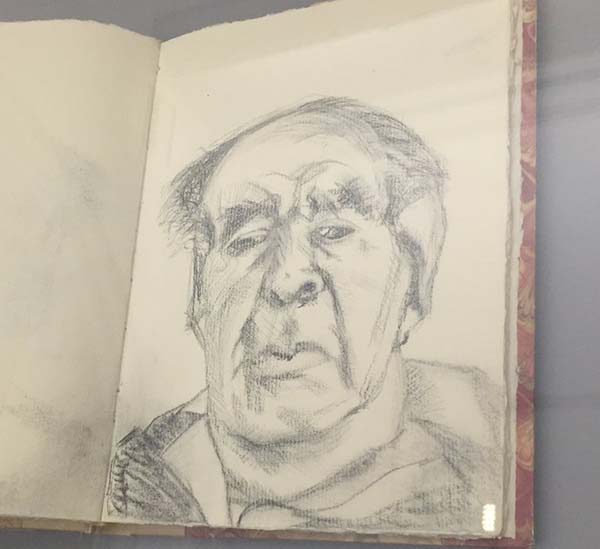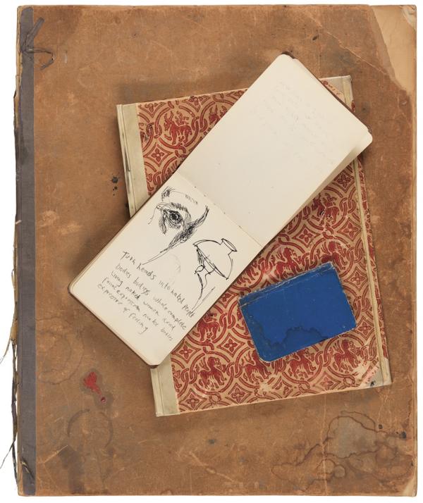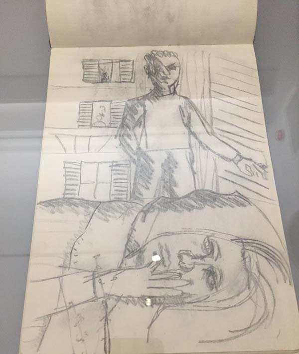 一同展出的弗洛依德的速写薄更像是一本艺术家的日记本,里面夹杂着草图、散记、电话号码,甚至赌博窍门,在写生簿中还有一条意识流的随想解释了为什么弗洛依德经常画裸体人物。他写道:“裸体女性避免展现面部表情,对裸体的探索让人物更富表现力。”