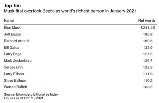 10月19日,彭博发布亿万富翁指数显示,马斯克的净资产达到了惊人的 2414 亿美元,排名高居榜首。盖茨以 1320 亿美元排名第四,巴菲特以 1035 亿美元排名第十。