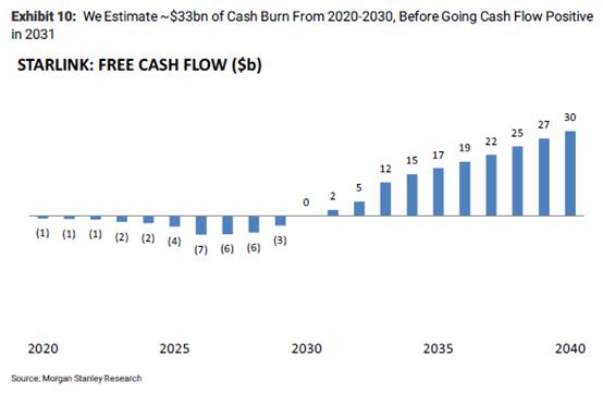 同时,在该研报中,该团队预计Starlink在2030年左右便可实现盈利。
