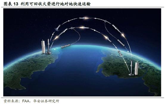 据华安证券张天团队整理分析,SpaceX积极探索亚轨道地对地运输方式,探索实现“一小时投送至全球”的目标。利用可回收火箭进行货物运输的速度将达到12000km/h以上,而目前C-17运输机的速度约为800km/h。猎鹰9的平均发射成本在5000万到6000万美元之间,火箭回收技术成熟后有望大幅降低,C-17运输机的飞行成本约为3万美元/小时。