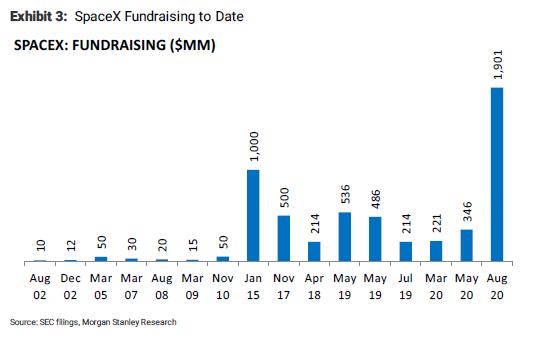 如上文提到,SpaceX的估值也随着SpaceX的高速发展取得了指数级的增长。在2020年,这家疯狂的科技公司甚至让大摩在三个月内给予了其翻倍的估值。