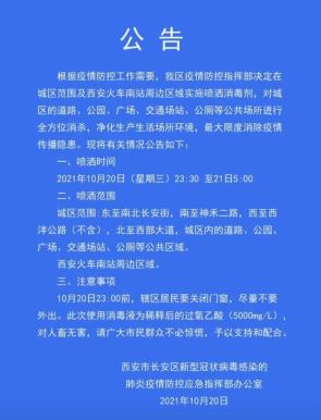 华商报记者从西安市长安区新型冠状病毒感染的肺炎疫情防控应急指挥部办公室获悉,长安区将于10月20日23:30 至21日5:00对城区范围及西安火车南站周边区域实施全方位消杀。