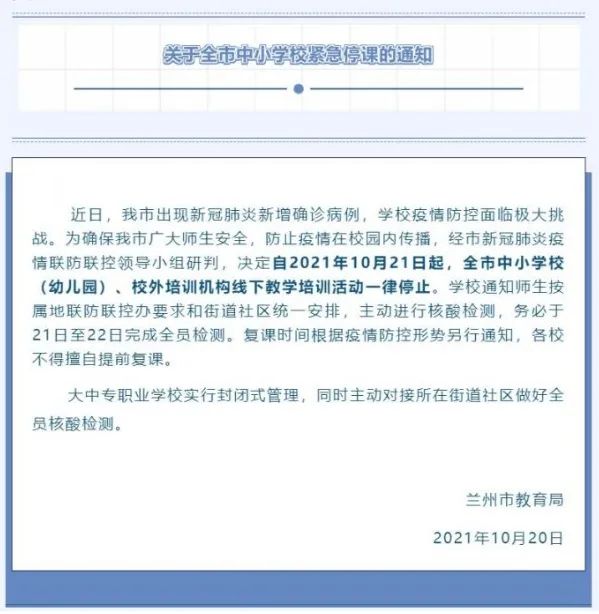 据甘肃兰州市教育局通报,由于近期兰州市出现新冠肺炎新增确诊病例,学校疫情防控面临极大挑战。为确保广大师生安全,防止疫情在校园内传播,经市新冠肺炎疫情联防联控领导小组研判,决定自2021年10月21日起,兰州全市中小学校(幼儿园)、校外培训机构线下教学培训活动一律停止。学校通知师生按属地联防联控办要求和街道社区统一安排,主动进行核酸检测,务必于21日至22日完成全员检测。复课时间根据疫情防控形势另行通知,各校不得擅自提前复课。大中专职业学校实行封闭式管理,同时主动对接所在街道社区做好全员核酸检测。