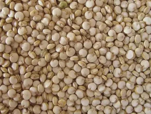 看饱满度——藜麦籽粒是中间鼓起的药片形状周边围绕着一圈白色的胚芽。好的藜麦籽粒均匀又大又饱满、色泽鲜亮发白、完整度好、碎粒少。如果扁平或者凹陷的,肯定是次品;