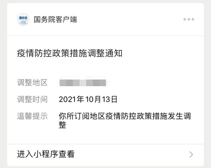 为方便大家第一时间掌握防控政策变化,国务院客户端小程序“”查询服务增加了“订阅”功能,订阅后一旦该地区防控政策发生变化,你将马上收到微信通知。