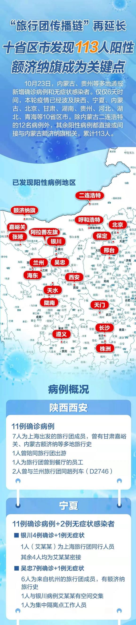 【本轮旅行团串联疫情确诊已超100人】10月17日至22日,这轮由“旅行团”串联起来的疫情已波及10个省区市,确诊病例数破百。梳理发现:①交通工具、餐厅成疫情聚集点;②确诊病例多为共同游玩、共同居住或处同一空间的密切接触者。