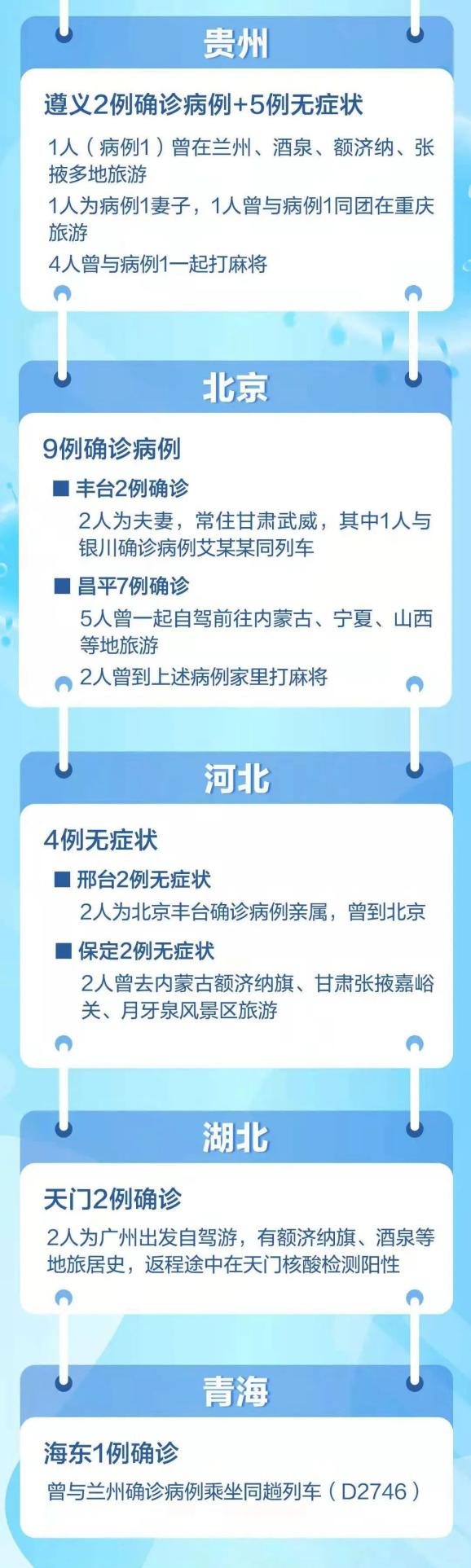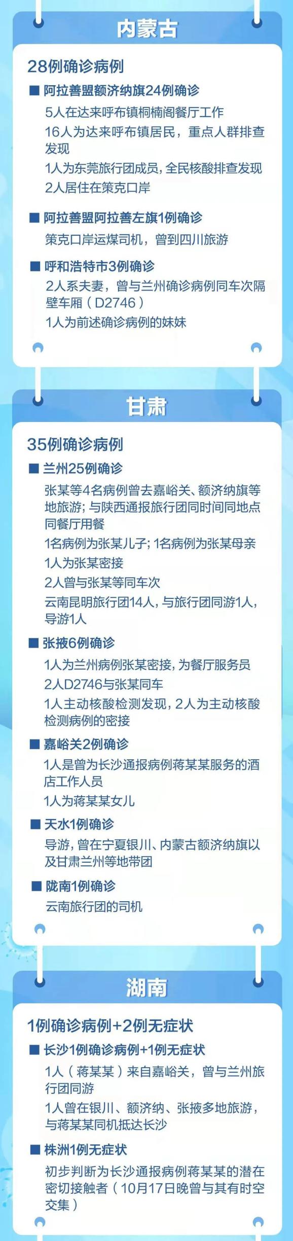 【云南两旅行团34人赴甘肃出游 14人已确诊】10月10日和10月15日,云南昆明两个旅行团共34人到甘肃旅游,其中一旅行团15日乘D2746动车由嘉峪关到兰州,20日后陆续已有14人在甘肃确诊。