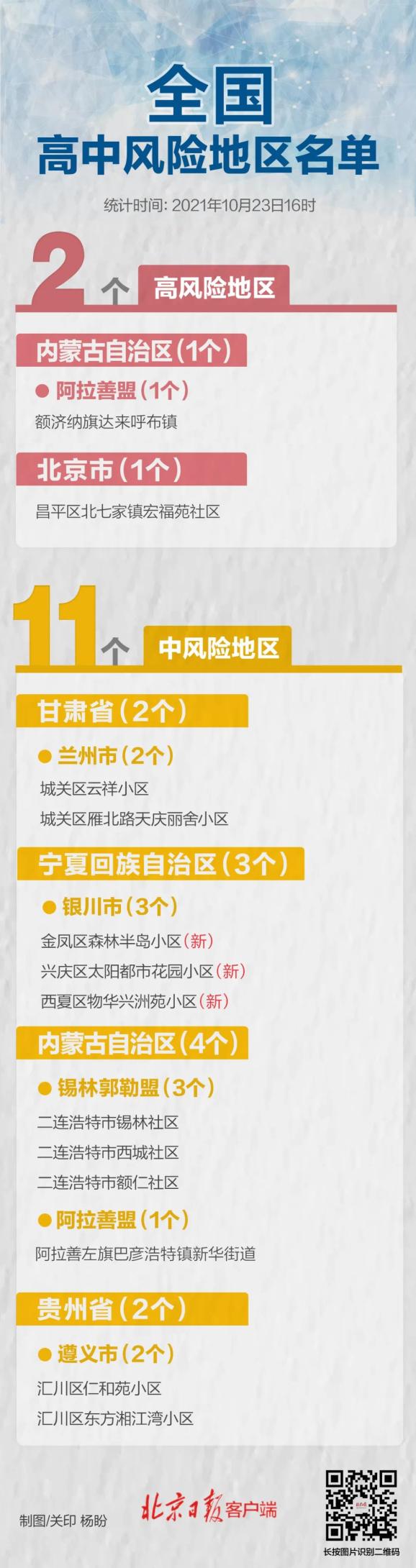 【现有高中风险2+11】昨天,北京昌平区北七家镇宏福苑社区由中风险地区调整为高风险地区,宁夏银川3小区升为中风险区,全国有高中风险区2+11个。