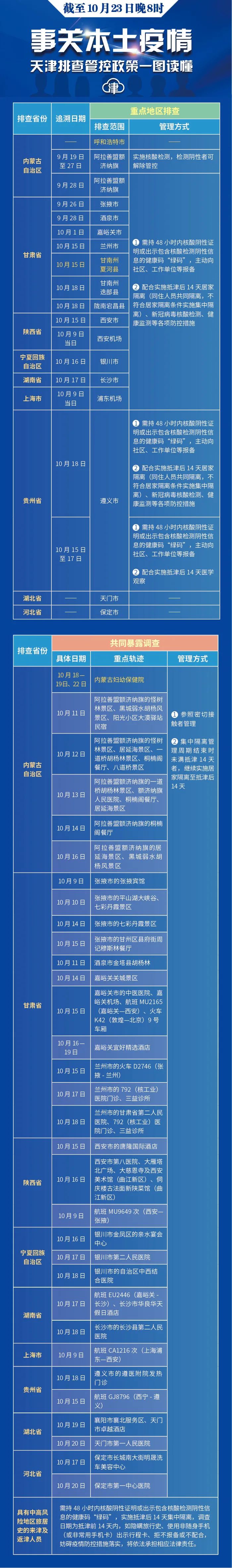 【天津一展会延缓举办】因全国多地爆发疫情,原定于10月28日至30日举行的碧海(中国)2021年秋季钓具产业博览会延缓举办。(详情)【天津两家美发机构停业整顿】近日,位于南开区嘉陵道的嘉旺造型和秀博美发工作室两家美发机构因防疫不力被停业整顿。(详情)【天津无新增】10月22日18时至23日18时,我市无新增本土新冠肺炎确诊病例,无新增境外输入新冠肺炎确诊病例,无新增无症状感染者,截至目前,尚有187人正在接受医学观察。(详情)国内外疫情防控