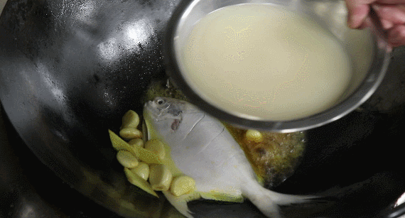2.放入鲳鱼,同时倒入少许料酒,定型去腥。
