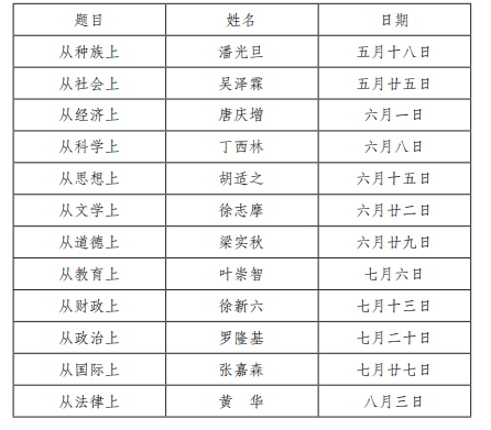 平社当然不仅仅是“聚餐”而已,平社社员关注当时的“中国问题”,都愿意从各自的专业背景出发直面“中国问题”,思考“中国问题”,探讨“中国问题”,寻求“中国问题”的解决之道。胡适1929年5月14日所拟的“平社中国问题研究日期单”就十分具体地说明了这一点。从中可以了解,以胡适为首的平社对当时中国所面临的社会、政治、经济、科学、思想、文学、道德、教育、财政、民族、法律、国际关系诸多问题都表示出浓厚的兴趣,拟组织专家撰写论文、主题演讲并展开研讨辩论。胡适还设想在此讨论、完善的基础上编刊《中国问题》一书,正式表达平社同人对这些问题的看法。虽然后来平社的活动未能完全按此计划进行,《中国问题》一书也未见问世,但平社其社其事,特别是平社对“中国问题”的论述(虽然只是胡适日记和之后的林语堂日记中所记载的三言两语)是很值得发掘研究的。更何况,平社这种学术交流的形式至今仍为一些知识分子群体所采用。