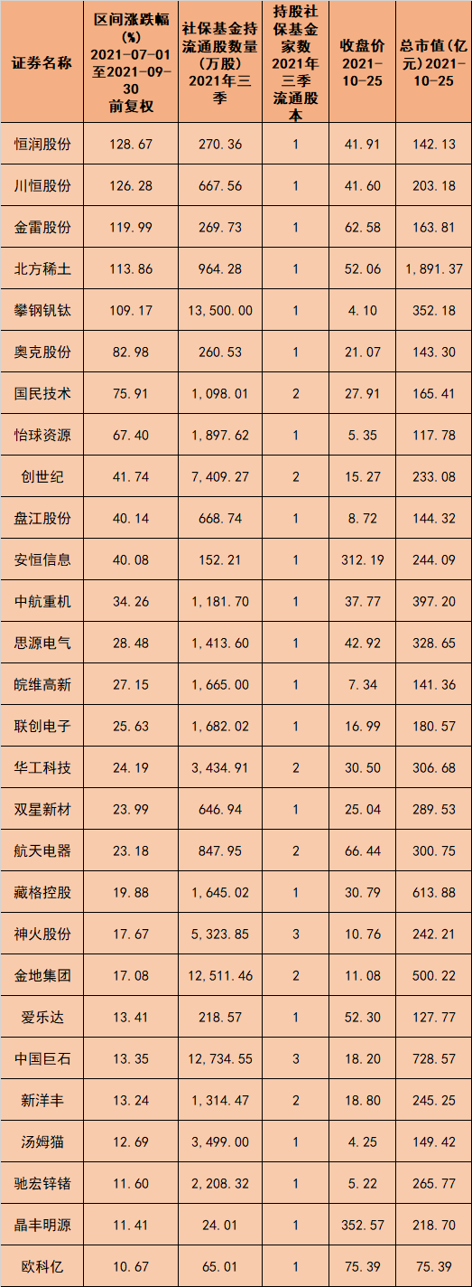 此外,三季度社保持仓的公司中,还有奥克股份、国民技术、怡球资源、创世纪等13只股票三季度涨幅超过20%。