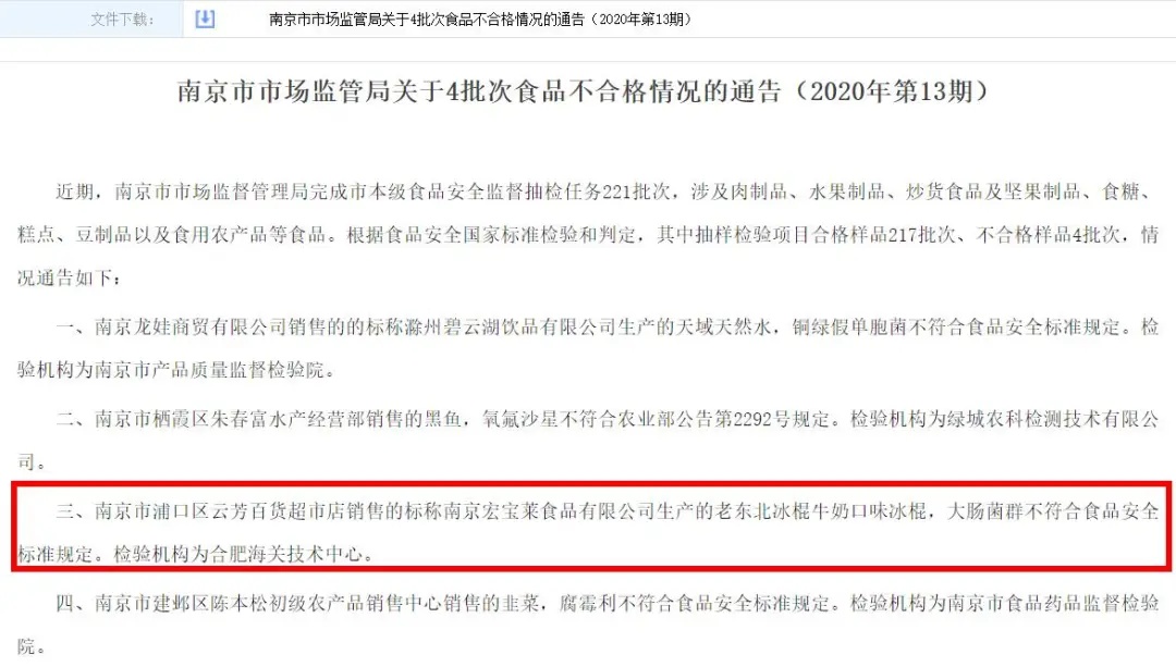 2020年4月3日,南京市市场监管局发布的关于4批次食品不合格情况的通告(2020年第13期)显示,南京市浦口区云芳百货超市店销售的、标称南京宏宝莱食品有限公司生产的老东北冰棍牛奶口味冰棍,大肠菌群不符合食品安全标准规定。