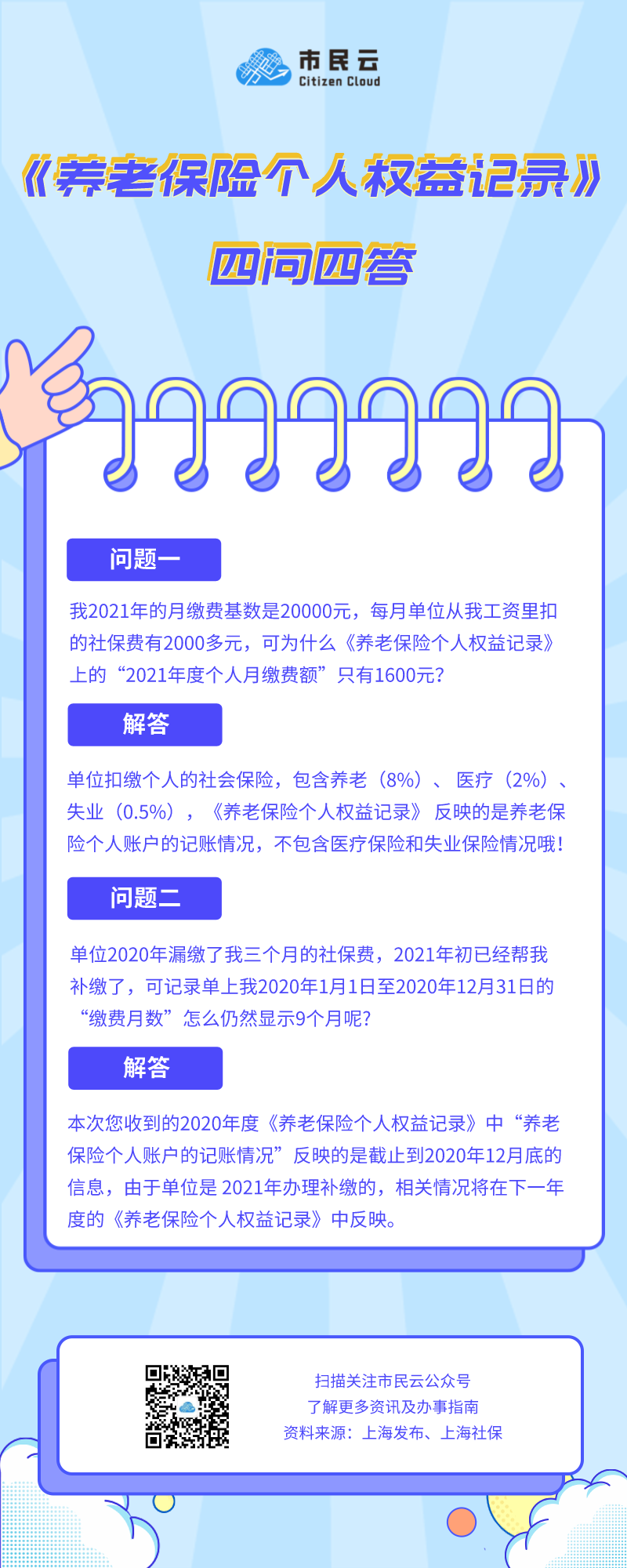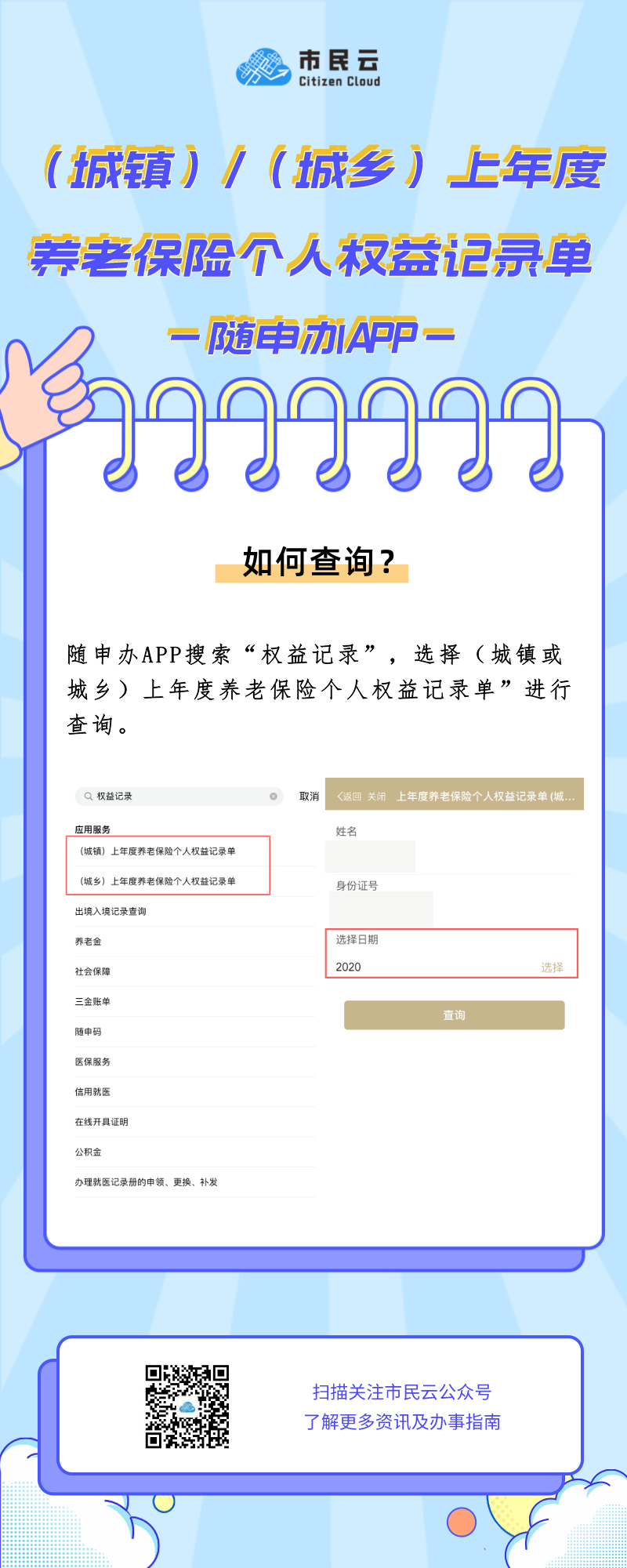 为进一步方便参保人员查询获取个人权益记录信息,2020年度电子《养老保险个人权益记录》已上线。有需要的朋友们可以登录“随申办市民云”APP进行查询↓