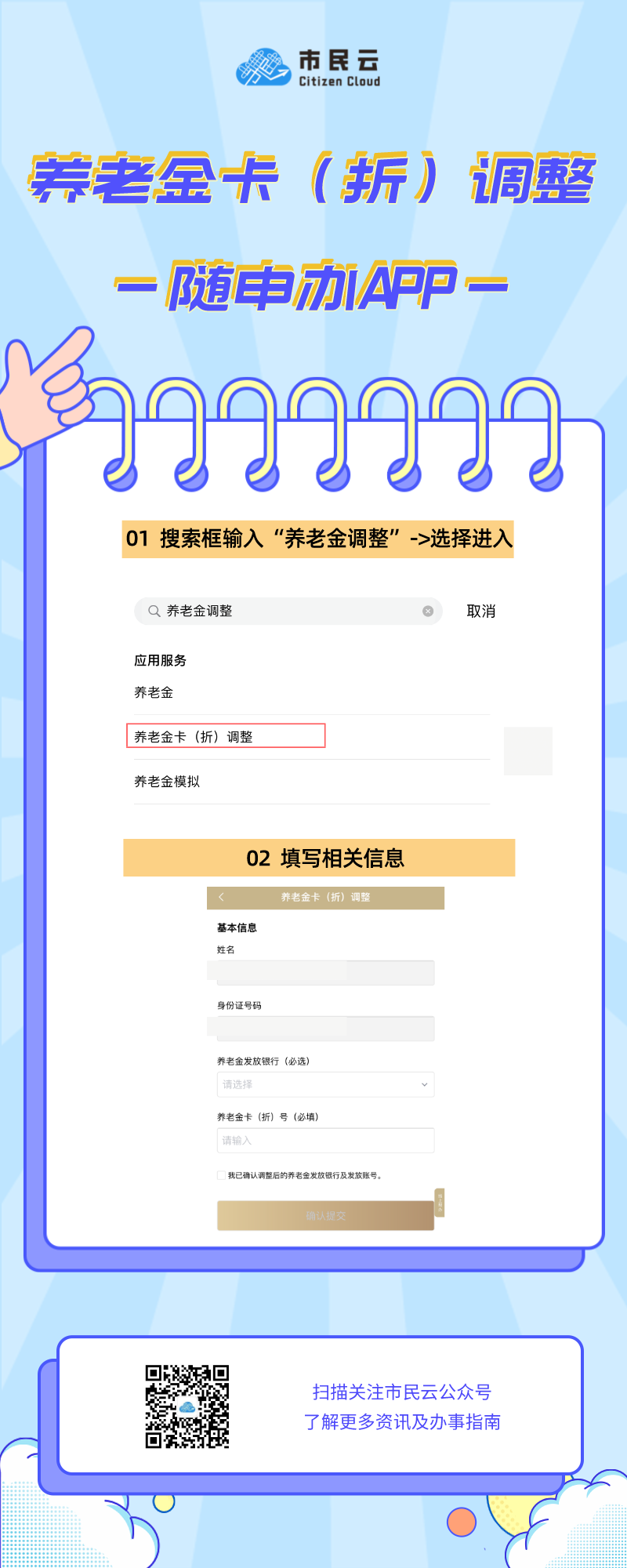 已经开始领养老金的退休人员,如果想变更领取养老金银行卡,可以使用“随申办市民云”APP【养老金卡(折)调整】服务,在线轻松调整养老金(折)信息