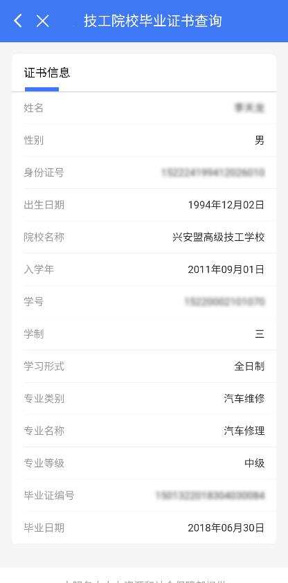 技工院校学生在申领电子社保卡后,可在电子社保卡客户端“服务”-“人才人事”-“技工院校学籍查询”中进行查询。个人无需填写任何信息即可查询证书信息,便捷高效。