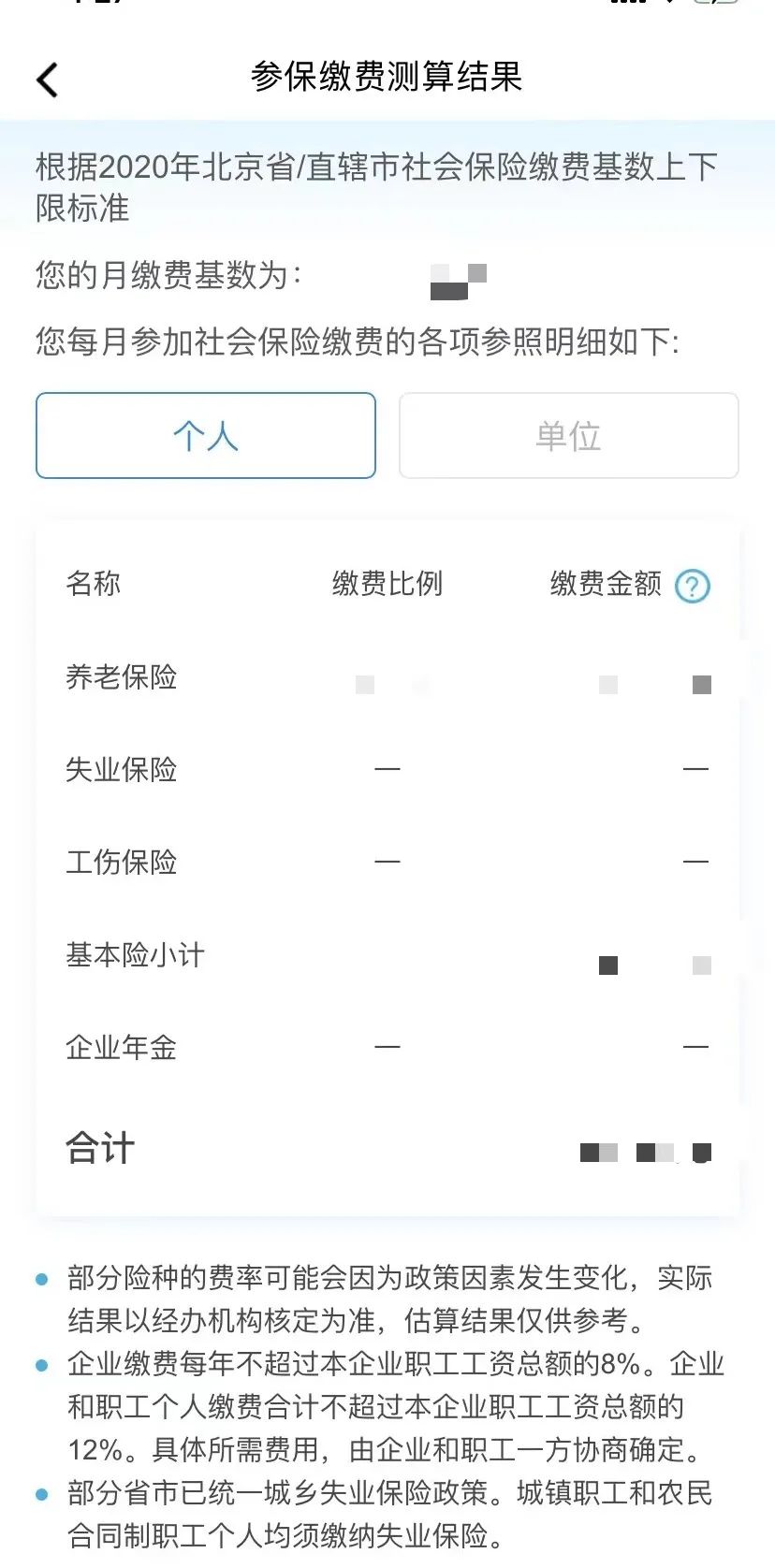 进入电子社保卡客户端“服务”-“社会保险”-“参保缴费测算”,根据自身行业选择城镇企业职工、机关事业单位人员、灵活就业人员等类别,填写相关内容,您每月参加社会保险缴费的各项参照明细参考如下: