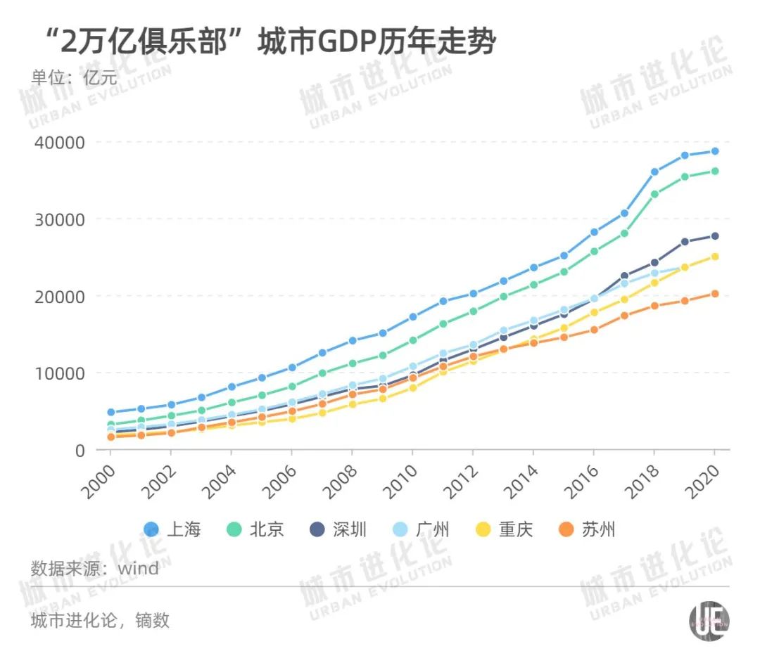 事实上,对比“破2万亿”的城市来看,苏州用时其实是最长的,从2011年突破“1万亿”大关到2020年跨过“2万亿”门槛,用了9年时间。而上海、北京、深圳跨越“1万亿”台阶用了6年,广州和重庆用了7年。