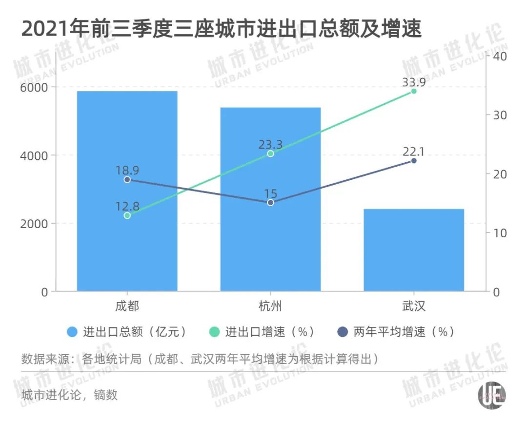 外贸方面,成都和杭州前三季度进出口总额均超过5000亿元,武汉则为2404.5亿元,后者增速达到33.9%,两年平均增速为22.1%,表现出快速增长的势头。