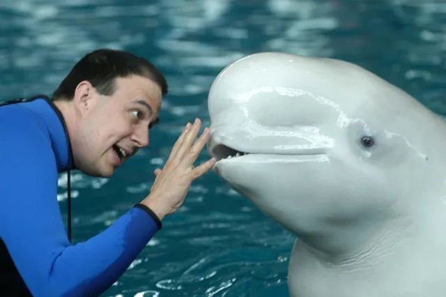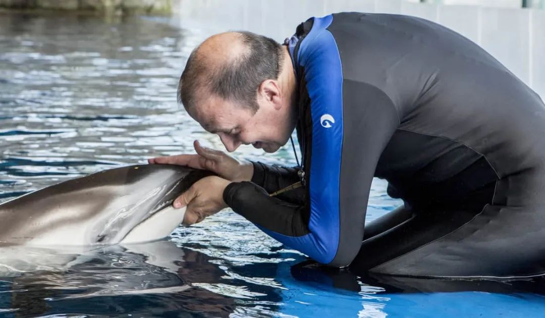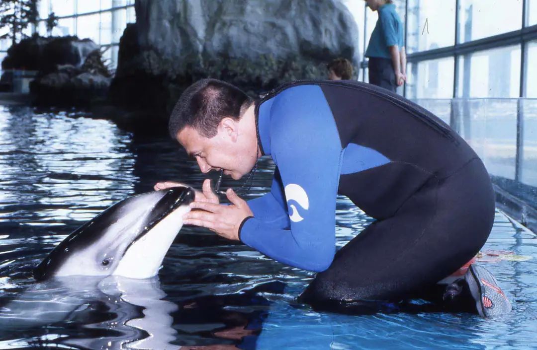 Ken Ramirez看着海豚,目光盛满温柔笑意。