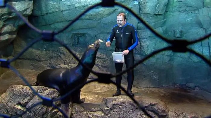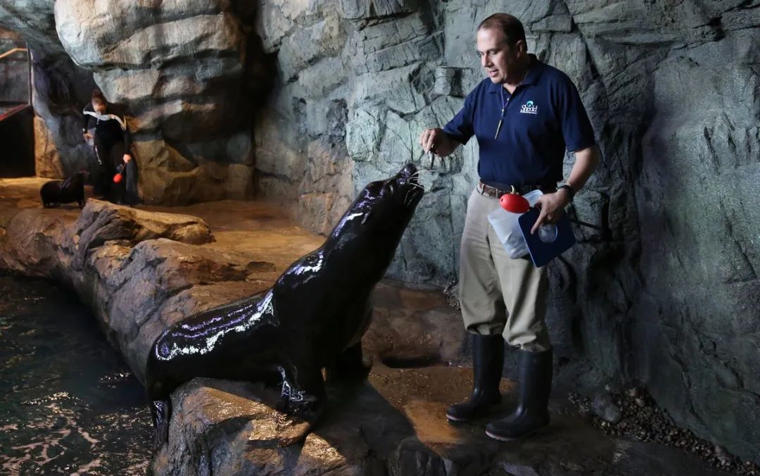 Ken Ramirez给盲人海狮克鲁兹喂鱼。©Antonio Perez / Chicago Tribune