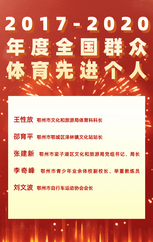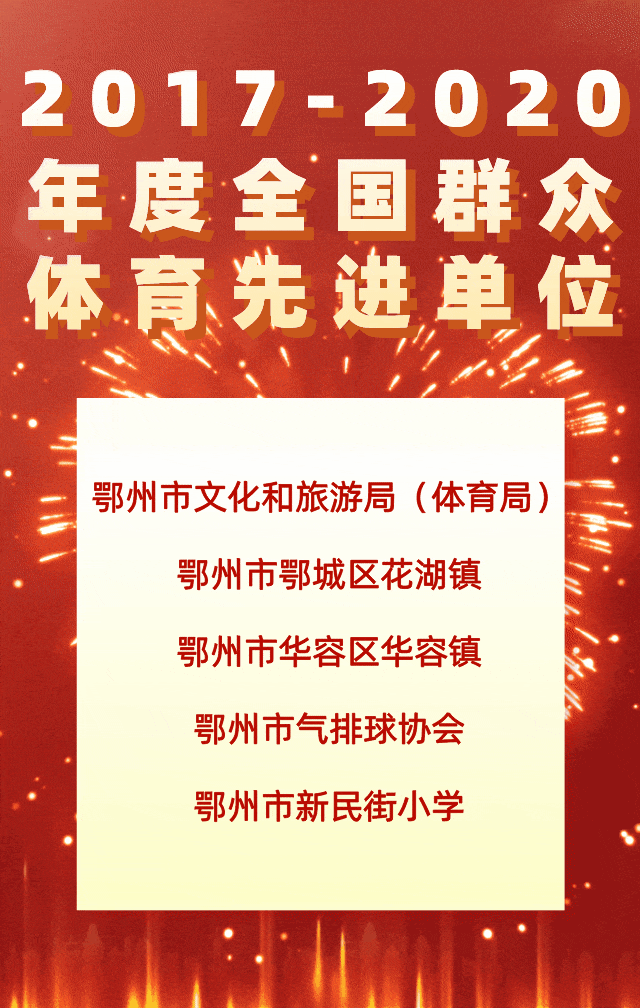 近日,国家体育总局发布关于表彰2017-2020年度全国群众体育先进单位和先进个人的决定,鄂州市五个集体获“2017-2020年度全国群众体育先进单位”称号,分别是:鄂州市文化和旅游局(体育局)、鄂州市鄂城区花湖镇、鄂州市华容区华容镇、鄂州市气排球协会、鄂州市新民街小学。鄂州市五名个人获“2017-2020年度全国群众体育先进个人”称号,分别是:王性放、邵育平、张建新、李奇峰、刘文波。