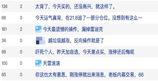 还有一些投资者表示,“太背了,今天买的,还没高兴就这样了。”“吓死了,昨天加自选,今天差点买,涨停还后悔呢。”