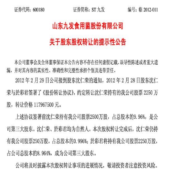 看似正常的股权划转,却在2012年2月份发生令人不解的事情,沈仁荣、於彩君夫妇二人将ST九发的股权“左手倒右手”。2012年2月28日,ST九发公告称,公司股东沈仁荣与於彩君签署了《股份转让协议》,约定转让沈仁荣持有的公司股票2250万股,转让价格1.18亿元,折合每股价格为5.24元。