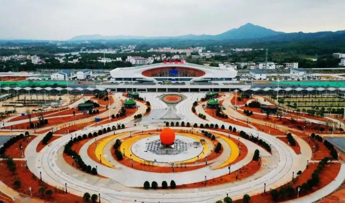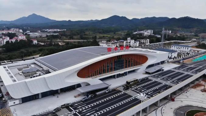 龙南东站位于赣州龙南市东侧的里仁镇,建筑面积1万平方米。该站以“双龙聚首、赣南门户”为设计理念,从龙南围屋中汲取灵感,诠释出龙南东站的客家新韵。定南南站