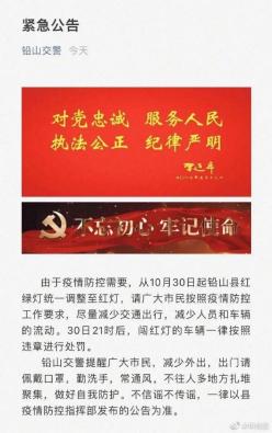 ▲江西发现1名核检阳性人员,铅(yán)山交警:红绿灯统一调为红灯,减少人车流动。由于疫情防控需要,从10月30日起铅山县红绿灯统一调整至红灯,请广大市民按照疫情防控工作要求,尽量减少交通出行,减少人员和车辆的流动。30日21时后,闯红灯的车辆一律按照违章进行处罚。铅山交警提醒广大市民,减少外出,出门请佩戴口罩,勤洗手,常通风,不往人多地方扎堆聚集,做好自我防护。不信谣不传谣,一律以县疫情防控指挥部发布的公告为准。
