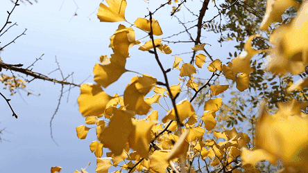 一片片扇形的黄叶随风飘落好像下起黄金雨