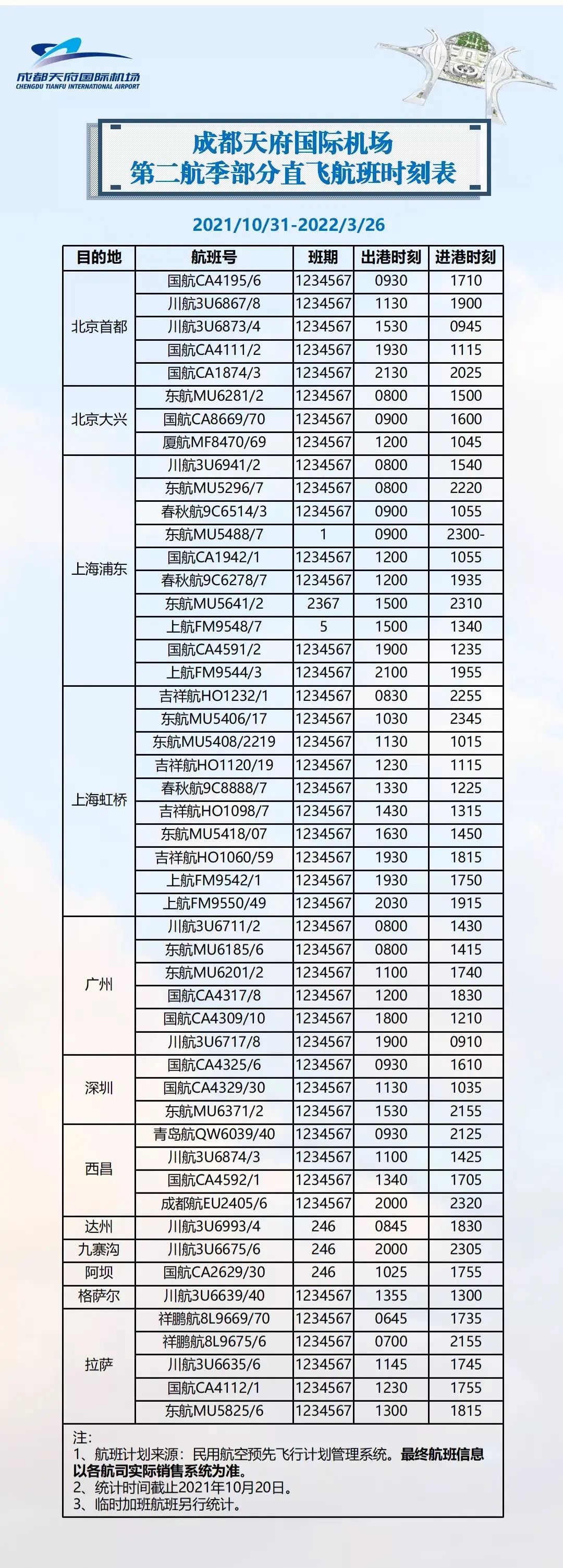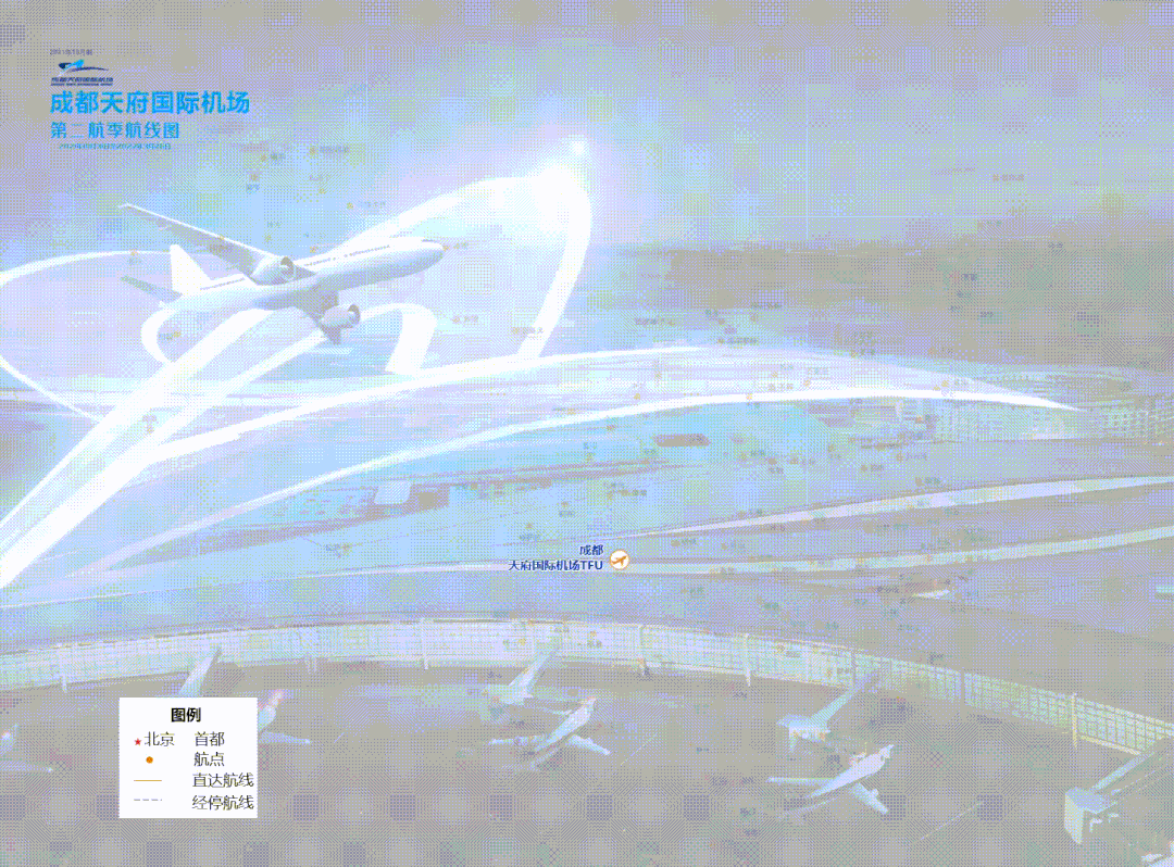 第二航季,天府国际机场按照“首都虹桥半点走,大兴浦东整点行,广州早中晚等您”的理念加密商务、旅游干线的航班频次。新增了九寨黄龙、阿坝红原、达州等省内支线航点。