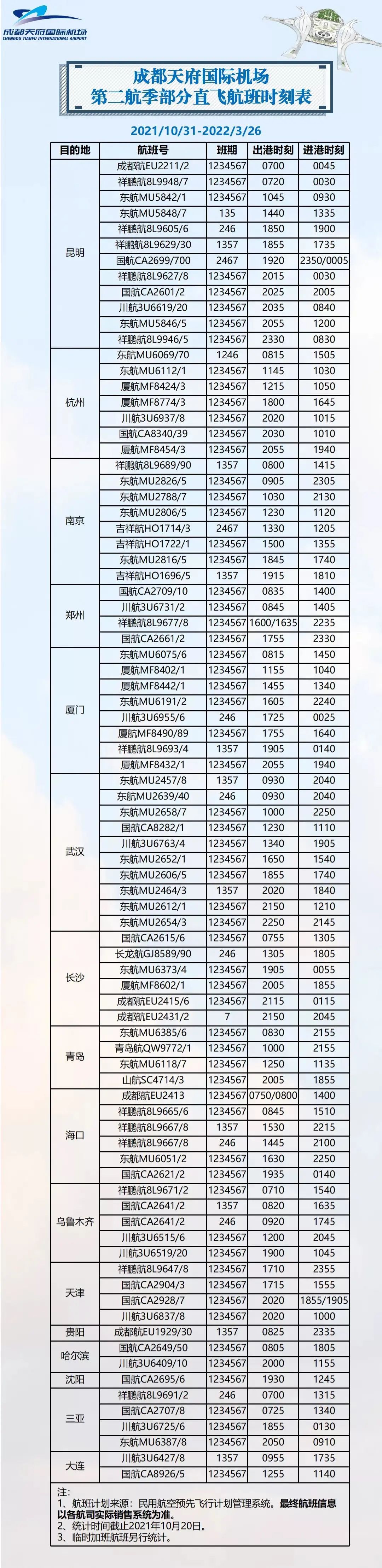 全部转场至天府机场运营:祥鹏航空、厦门航空、春秋航空、吉祥航空、浙江长龙航空、山东航空、上海航空、青岛航空8家航空公司;