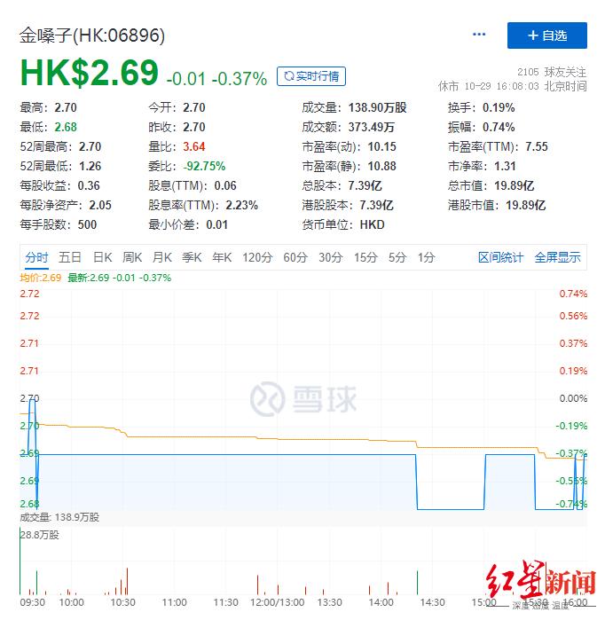受此消息影响,截至10月29日收盘,金嗓子股价报收2.69港元,跌0.37%,市值不到20亿港元。上市6年以来,金嗓子股价曾从每股最高6元多下挫至1元多,市值最多缩水达90%。