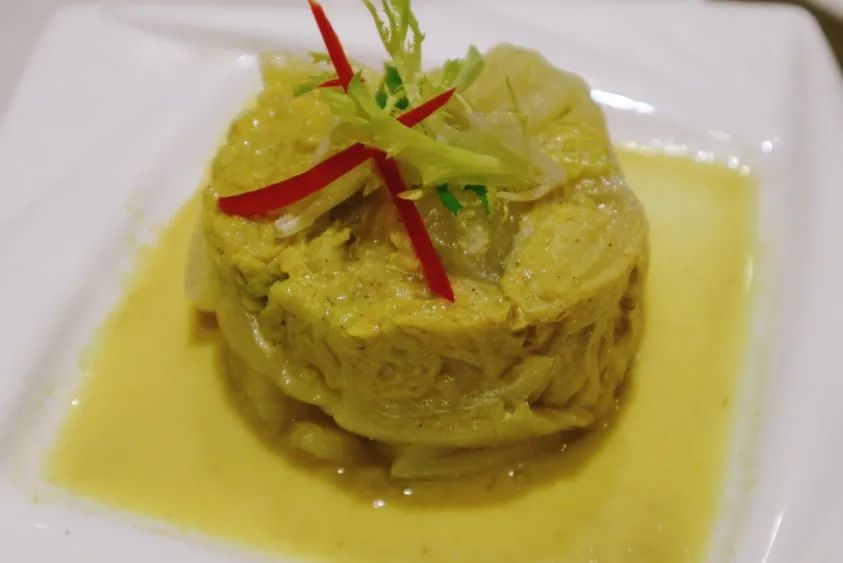 它是层层白菜叶围成的墩儿,每一层里都饱满地渗着黄芥末,看着怕人,吃的时候却要放糖,突出好白菜本身的甜味儿。能赏鉴到这一层,大概能领略一些北京百姓菜里的智慧了。