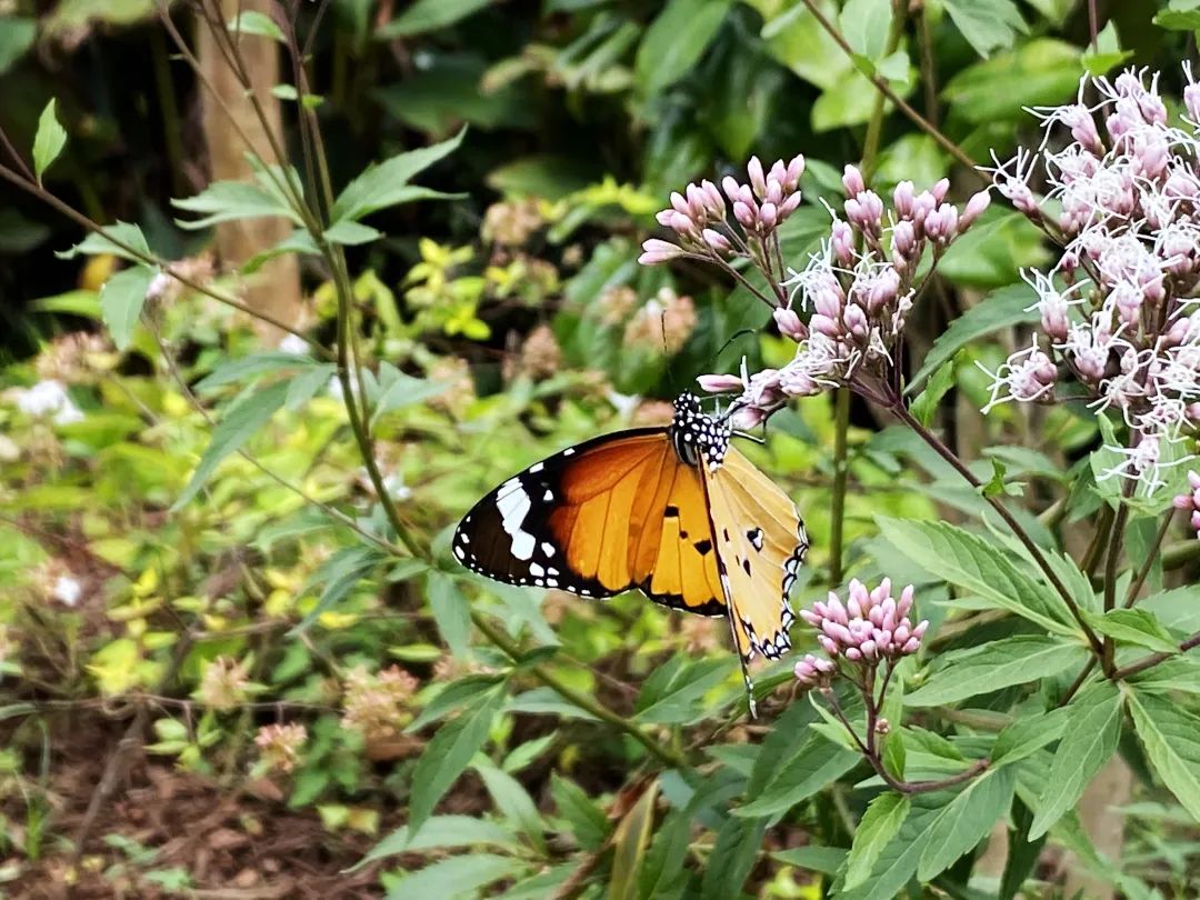 佩兰叶片细长油绿,形似狭叶十大功劳,枝茎紫红色,红枝绿叶十分有特色;其枝干顶端开出头状花序,十分密实;紫红色的花苞中间吐露出白色丝状花瓣,如同绽放的烟花,盛花期白紫一片,十分热闹;佩兰花期长,由盛夏时节一直能够开放到深秋,在林下经久不衰,占尽风情;佩兰除了颜值外,香味也是它的一大特色,其花香似薰衣草,幽然而舒适,易“招蜂惹蝶”,故经常上演“蝶恋花”的有趣景象,为绿带增添了活泼与野趣。在环城绿带中