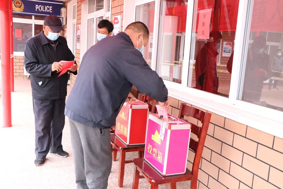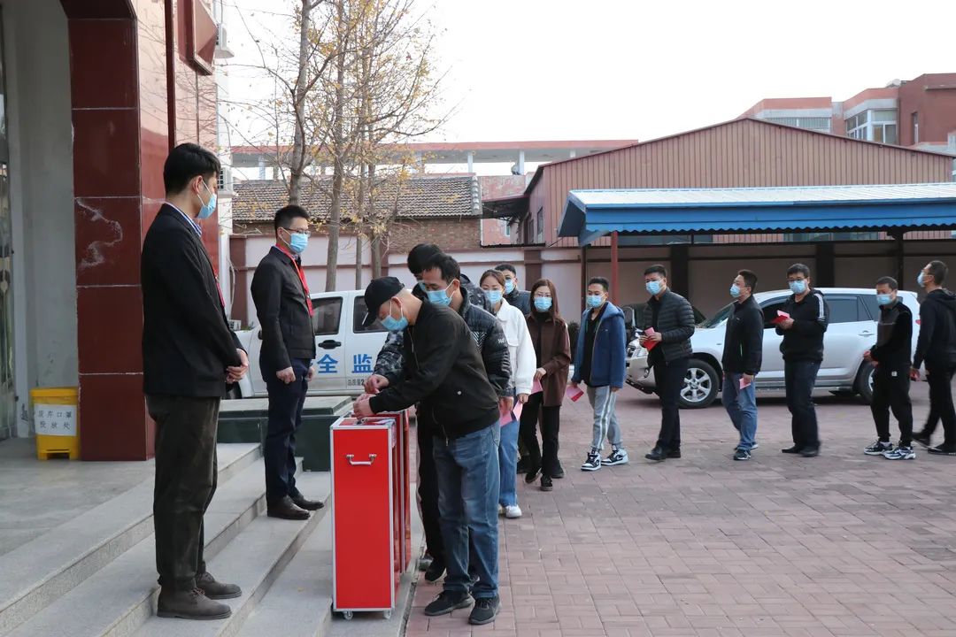 在陈咀镇庞庄村投票站,选民们排队整齐,在登记、测温、验码后,由工作人员引导,按规定程序投下庄严一票。同时,该村由两名工作人员、两名监督员为一组,分多组带着流动票箱至选民家中供选民参投。